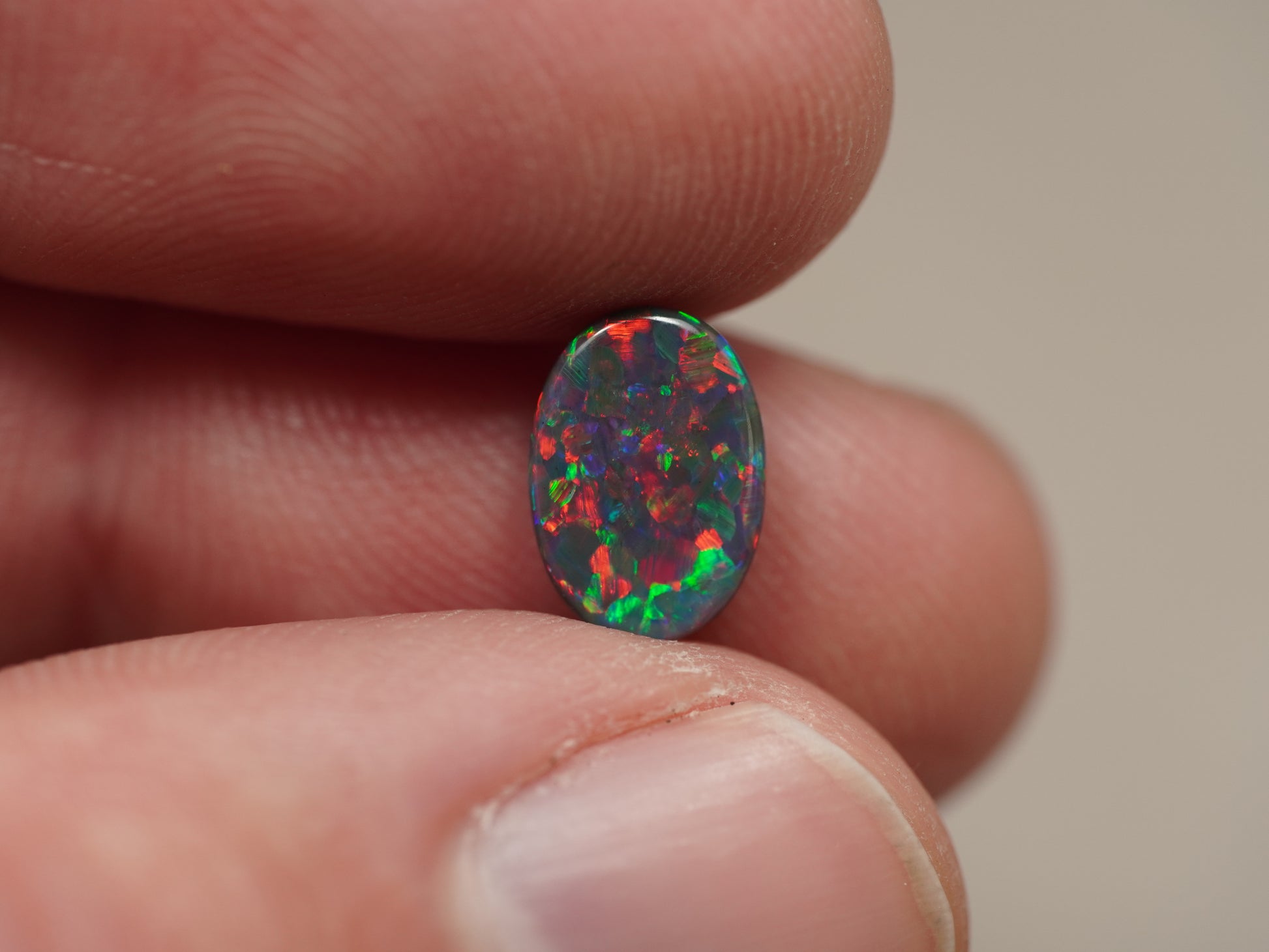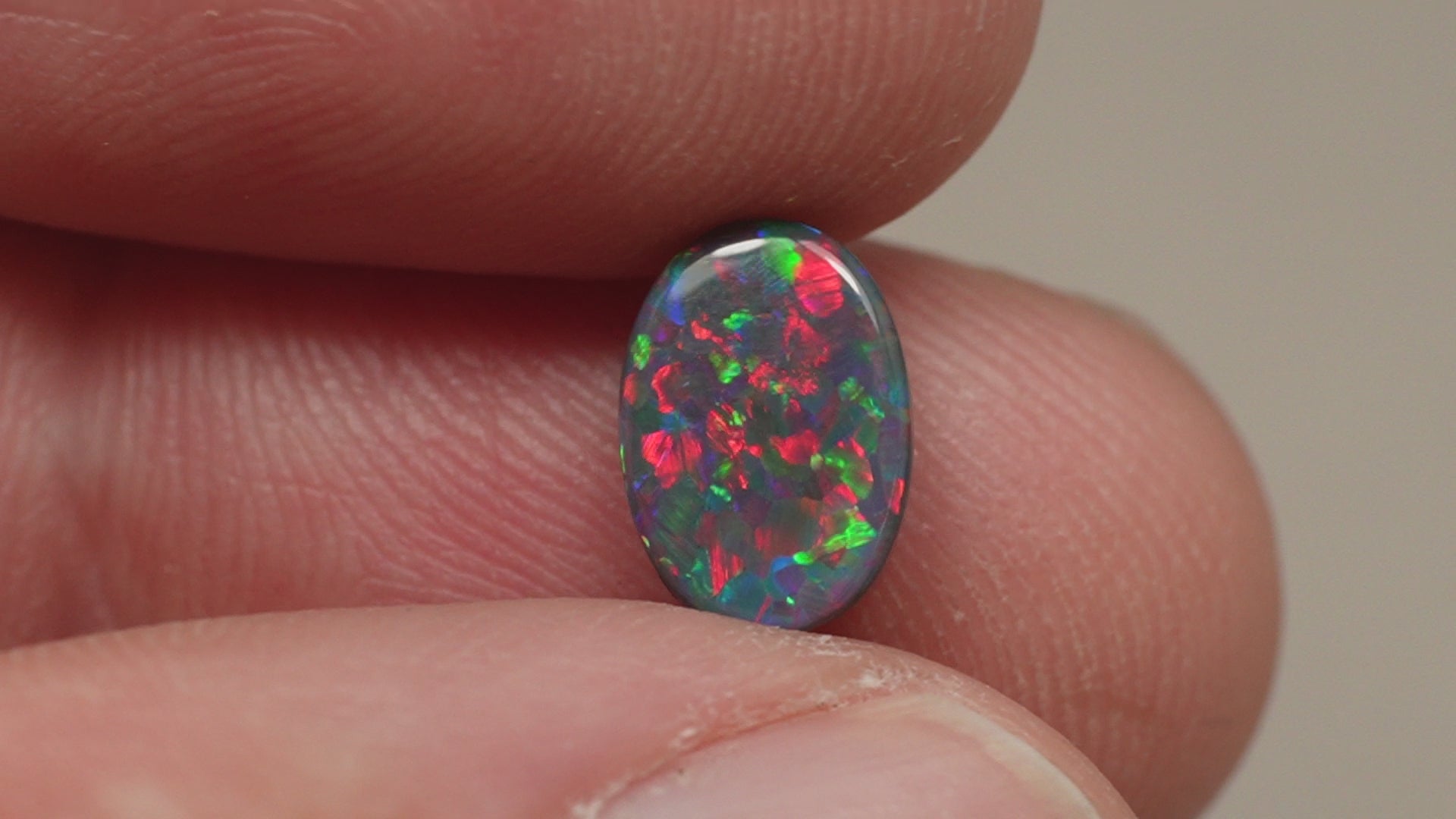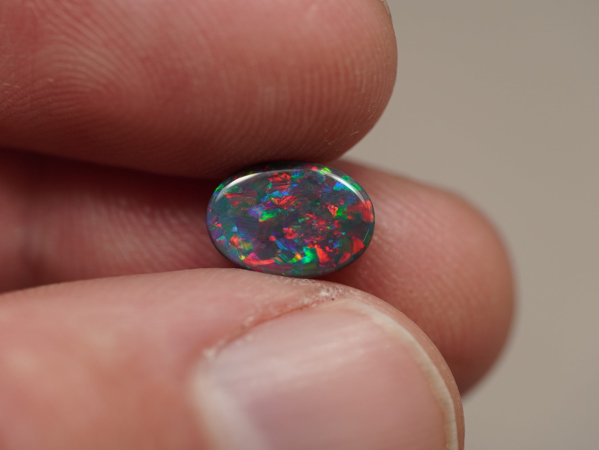 A true black opal, with bright (red!) colourplay.