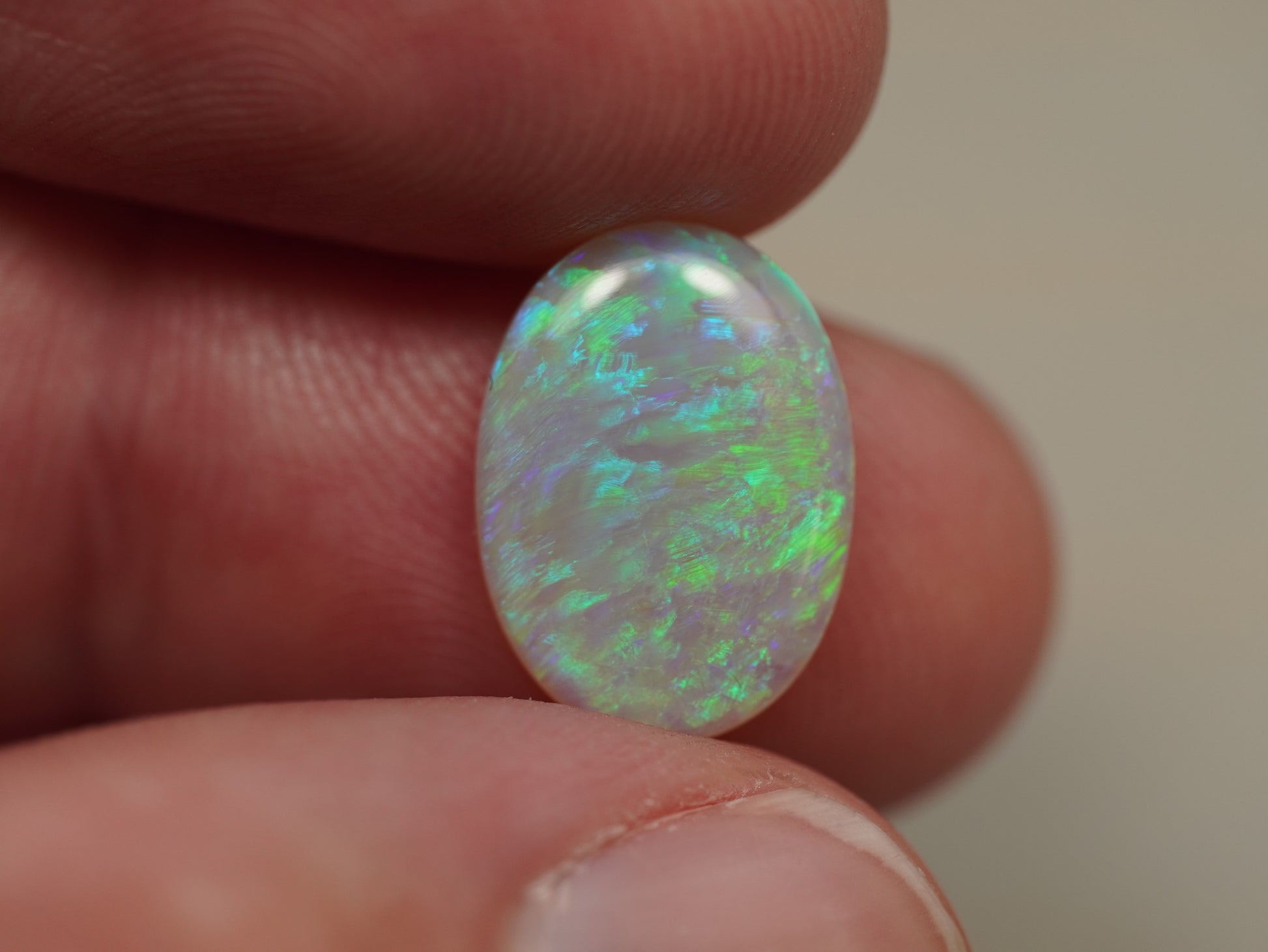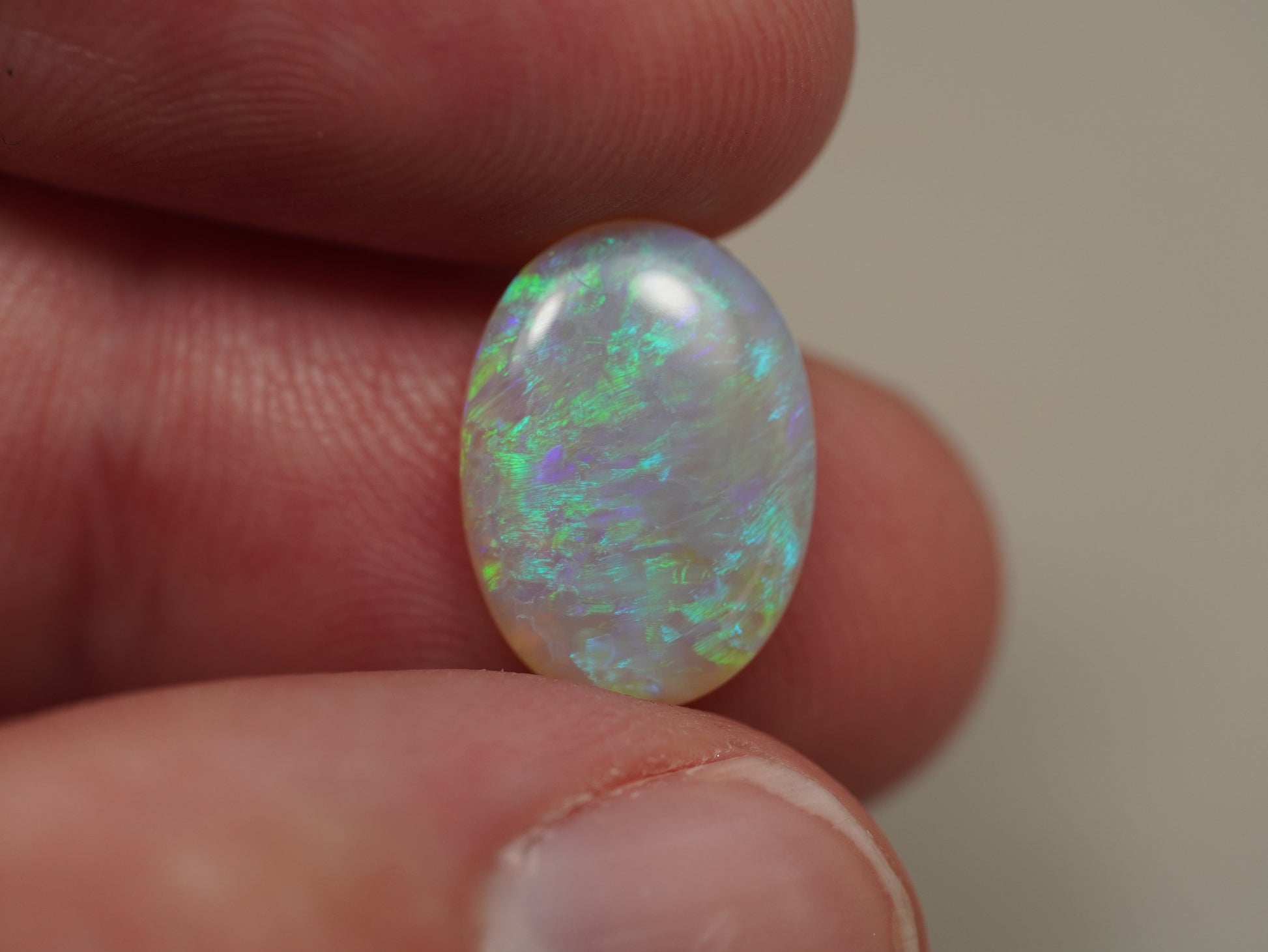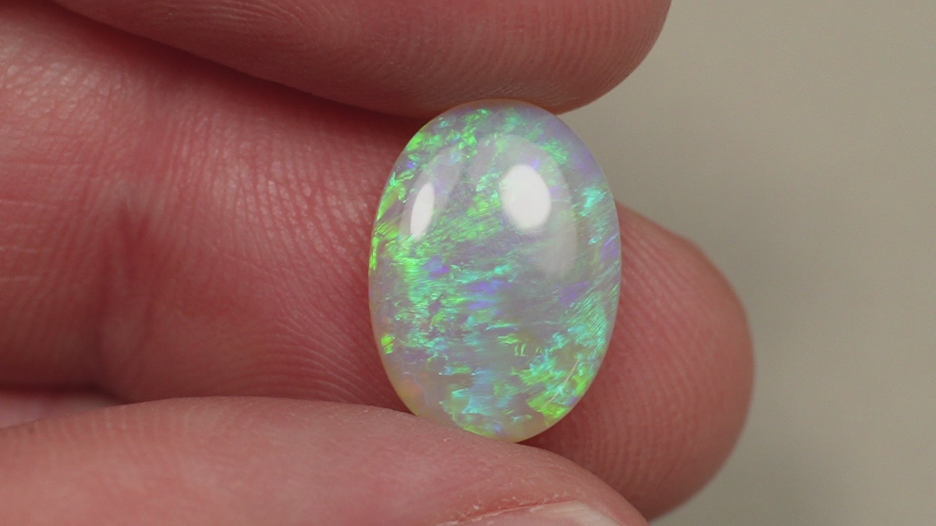 1. The photo's and video's are taken under 5500 Kelvin LED lights, this is the closest to natural daylight and gives a fair representation of the opal. Keep in mind that an opal may look different under different lightsources.